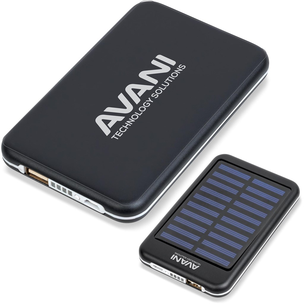 This power bank can be charged via a USB power source or through the power of the sun. It has a slim design and plenty of branding space.